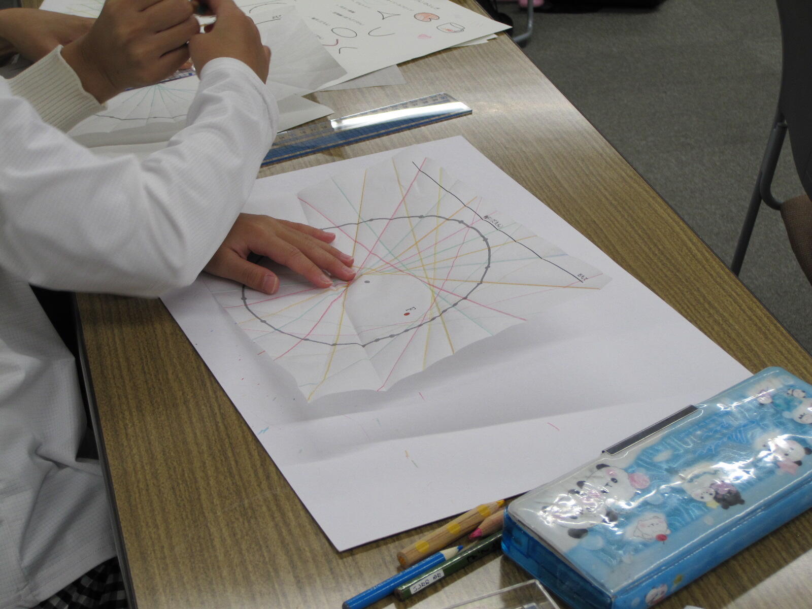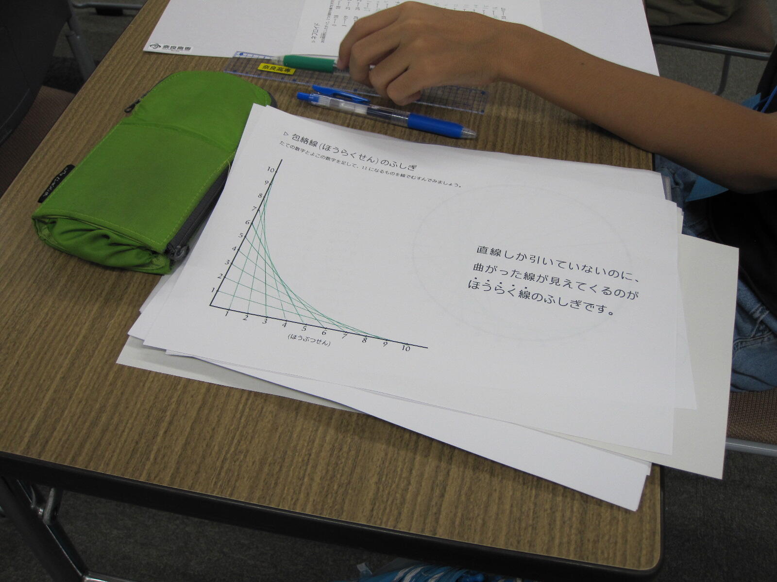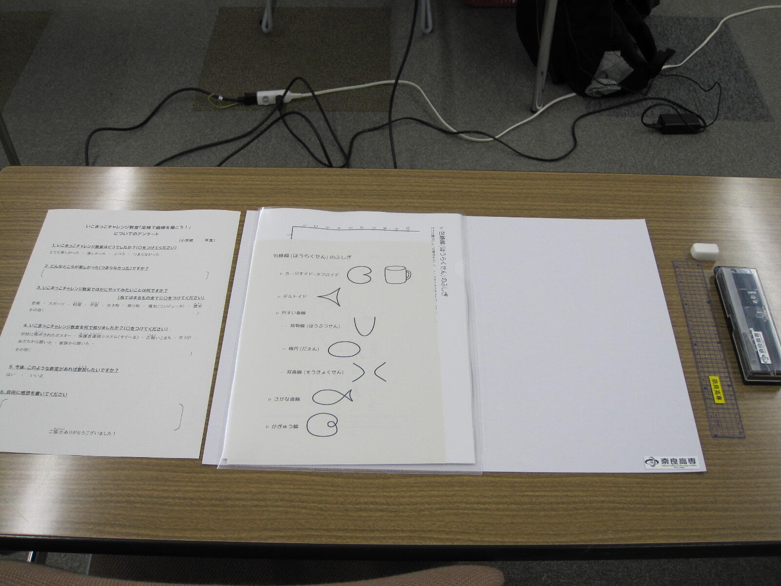 社会貢献 科学教室 「いこまっこチャレンジ教室『定規で曲線を描こう!』」(令和7年10月5日 於 生駒市) 令和7年10月5日(日)、生駒市との学市連携協定事業の一環として、いこまっこチャレンジ教室「定規で曲線を描こう!(一般教科(数学)担当)」を生駒市コミュニティーセンターで開講し、生駒市内の小学3~6年生15名が参加しました。 一般教科 矢野充志助教が講師を務め、飯間圭一郎准教授、山中聡恵准教授、鷲野朋広准教授、豊田洋平助教の協力のもと、以下の内容で実施しました。 「包絡線(ほうらくせん)のふしぎ」 包絡線とは、「与えられた曲線たちに接するような曲線」と表現され、数式にすると難解な数学の世界ですが、今回は直線を引くだけで曲線が浮かび上がる様子などを視覚的に体感してもらい、実生活の身近なところにも数学があることを知ってもらうことを目的に、以下の課題を準備しました。 縦と横の数字を足して「11」になるように線を結ぶと... カージオイド・ネフロイド デルトイド 円すい曲線:放物線(ほうぶつせん)、楕円(だえん)、双曲線(そうきょくせん) かぎゅう線(リマソン):コンパスを使用します さかな曲線 本日の課題 包絡線(ほうらくせん) カージオイド ネフロイド デルトイド 受講中の様子 コンパスを使って線を描きます かぎゅう線(リマソン) 円すい曲線 楕円(だえん)に挑戦 懐中電灯の光の先に放物線が現れました 3Dプリンタで作った模型を使って説明 さかな曲線 長時間にわたる作業で少し疲れた様子も見られましたが、受講生の皆さんが集中して完成させた色とりどりの作品は、とても美しく仕上がっていました。時間内に完成できなかった課題は、ぜひ家で描いて、今日体験した数学の世界を振り返っていただければ嬉しく思います。
