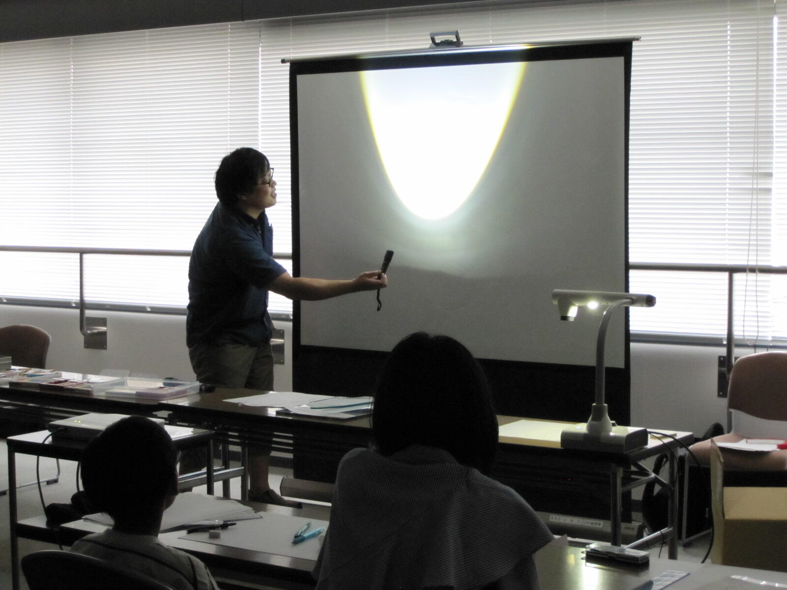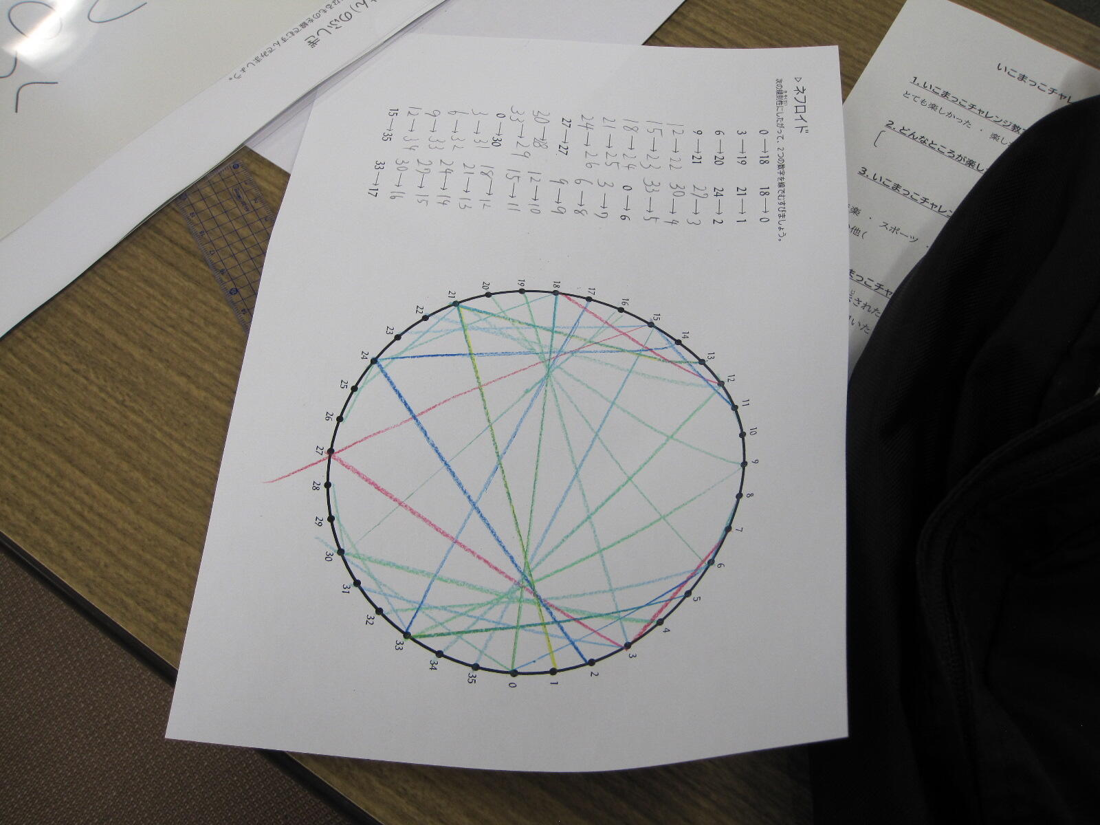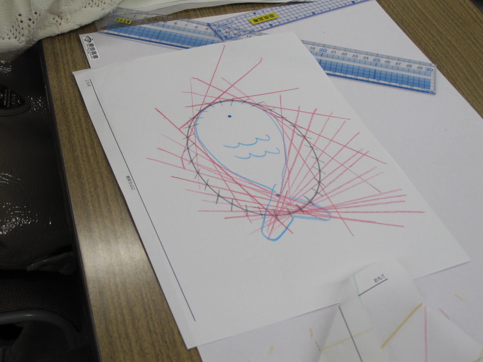 社会貢献 科学教室 「いこまっこチャレンジ教室『定規で曲線を描こう!』」(令和7年10月5日 於 生駒市) 令和7年10月5日(日)、生駒市との学市連携協定事業の一環として、いこまっこチャレンジ教室「定規で曲線を描こう!(一般教科(数学)担当)」を生駒市コミュニティーセンターで開講し、生駒市内の小学3~6年生15名が参加しました。 一般教科 矢野充志助教が講師を務め、飯間圭一郎准教授、山中聡恵准教授、鷲野朋広准教授、豊田洋平助教の協力のもと、以下の内容で実施しました。 「包絡線(ほうらくせん)のふしぎ」 包絡線とは、「与えられた曲線たちに接するような曲線」と表現され、数式にすると難解な数学の世界ですが、今回は直線を引くだけで曲線が浮かび上がる様子などを視覚的に体感してもらい、実生活の身近なところにも数学があることを知ってもらうことを目的に、以下の課題を準備しました。 縦と横の数字を足して「11」になるように線を結ぶと... カージオイド・ネフロイド デルトイド 円すい曲線:放物線(ほうぶつせん)、楕円(だえん)、双曲線(そうきょくせん) かぎゅう線(リマソン):コンパスを使用します さかな曲線 本日の課題 包絡線(ほうらくせん) カージオイド ネフロイド デルトイド 受講中の様子 コンパスを使って線を描きます かぎゅう線(リマソン) 円すい曲線 楕円(だえん)に挑戦 懐中電灯の光の先に放物線が現れました 3Dプリンタで作った模型を使って説明 さかな曲線 長時間にわたる作業で少し疲れた様子も見られましたが、受講生の皆さんが集中して完成させた色とりどりの作品は、とても美しく仕上がっていました。時間内に完成できなかった課題は、ぜひ家で描いて、今日体験した数学の世界を振り返っていただければ嬉しく思います。