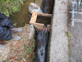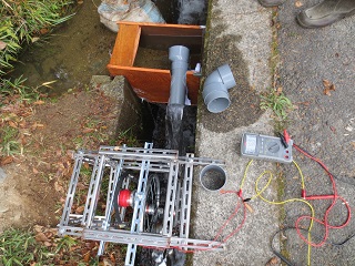 水車回転数を上げてバッテリーの充電に必要な電圧を確保するため、水路の水流を工夫し、木箱スタイルの水流貯め込みスペースを作り、水路の水が水車の回転と同じ方向から流れ落ちるよう現場の水路を改良するなど、的野地区の皆さんのアイデアが活かされました。