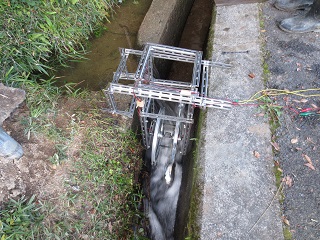 平成28年10月30日(日)、天候にも恵まれ、関係者が見守る中、水車が水路に仮設置され、勢いよく回り出しました。ただ、今回の試みでは目標とする回転数、周波数にはわずかながら届かず、引き続き、水路の水を水車に当てる方向や位置等を検討していくことで回転数を上げ電灯を灯せるよう的野地区の皆さん・吉野小水力利用推進協議会の方々と一緒に取り組んでまいります。