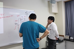 人材育成事業 平成29年度 スイッチング電力変換機器の開発人材育成ベーシックコースの実施の様子(第8回) 【10月1日】 服部特命助教の講義で第8回目の講義が始まりました。今日の講義は実験でゲート駆動回路の設計です。 回路組み立てに使用する電子部品の説明をしています。 電子バイキング。ここから任意の電子部品を選び回路を組み立てます。 補助員が受講生をサポートしています。 受講生同士で図面をチェックしながら回路を組んでいきます。 テスターを使って組み立てた回路をチェックしています。 本日の実験の続きを次回に行います。第8回目終了。受講生の皆様お疲れ様でした。