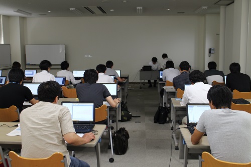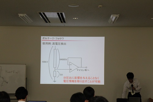 人材育成事業 スイッチング電力変換機器の開発人材育成 ベーシックコースの実施の様子(その6) 【8月20日(土)】 午前の講義の最初は前回のおさらいで、服部特命助教よりデューティサイクルDとチョッパの昇圧比に ついて説明がありました。 その後、シミュレータPSIMを使って入出力電圧の方程式どおり動作するかを確認します。 補助員が逐次、受講生のサポートをしています。 シミュレータPSIMを用いて、昇圧チョッパの各種パラメータを変動させた場合の挙動を、1つ1つ解説して います。 続いて、石飛准教授によるシミュレータPSIMを使った講義風景。 スイッチング周波数がどのような影響を回路に与えるか様々な状況下での現象を確認しています。 また、受動部品のサイズに関する講義も同時に行いました。 ここではインダクタのサイズとキャパシタのサイズに関してより詳細な解説を行われています。 補助員より昇圧チョッパ制御部に使うオペアンプの動作について説明がありました。 シミュレータPSIMを使ってオペアンプを組み込んだ場合の回路図を描き説明どおり動作するか確認を します。 より詳細に理解するため、石飛准教授より補足解説がありました。 ブレッドボードにオペアンプ、抵抗等を組み込んで、実際にボルテージフォロアや電圧が増幅する様子を 計測実験します。 当初、実験を進めてもテスターで狙いどおりの数値が測定できませんでしたが、受講生は試行錯誤を 繰り返し、適切な抵抗値を選択することで測定することができました。 石飛准教授が実験後に解説をしています。結果が出るまであきらめずに粘り強く取り組む受講生の姿 勢が素晴らしかったです。 7回目終了。皆様お疲れ様でした。