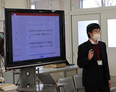 産学協働・地域創生研究センター オンライン授業支援ツール研修を実施しました 電子制御工学科 中村篤人准教授は、 令和3年2月3日(水)に式下中学校組合教育委員会の依頼に基づき Google for Educationの活用促進を目的とした研修を実施しました。 今回は式下中学校の先生方がシステムに馴染み、 活用いただく上で知っておきたい基本操作を説明し、 本校での授業における活用事例も交えながら ロールプレイを織り交ぜた研修になりました。 校長先生をはじめ、29名の先生方に参加いただき、 熱心に中村准教授の講義に聞き入っていました。