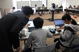玉木准教授も小学生を指導しています。お隣同士でプログラムを確かめ合っています。