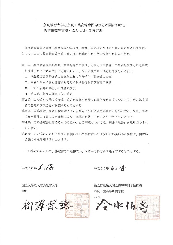 平成20年6月18日、本校と奈良教育大学との間で教育、学術研究及びその他の協力関係を推進するため、教育研究等交流・協力に関する協定を締結しました。