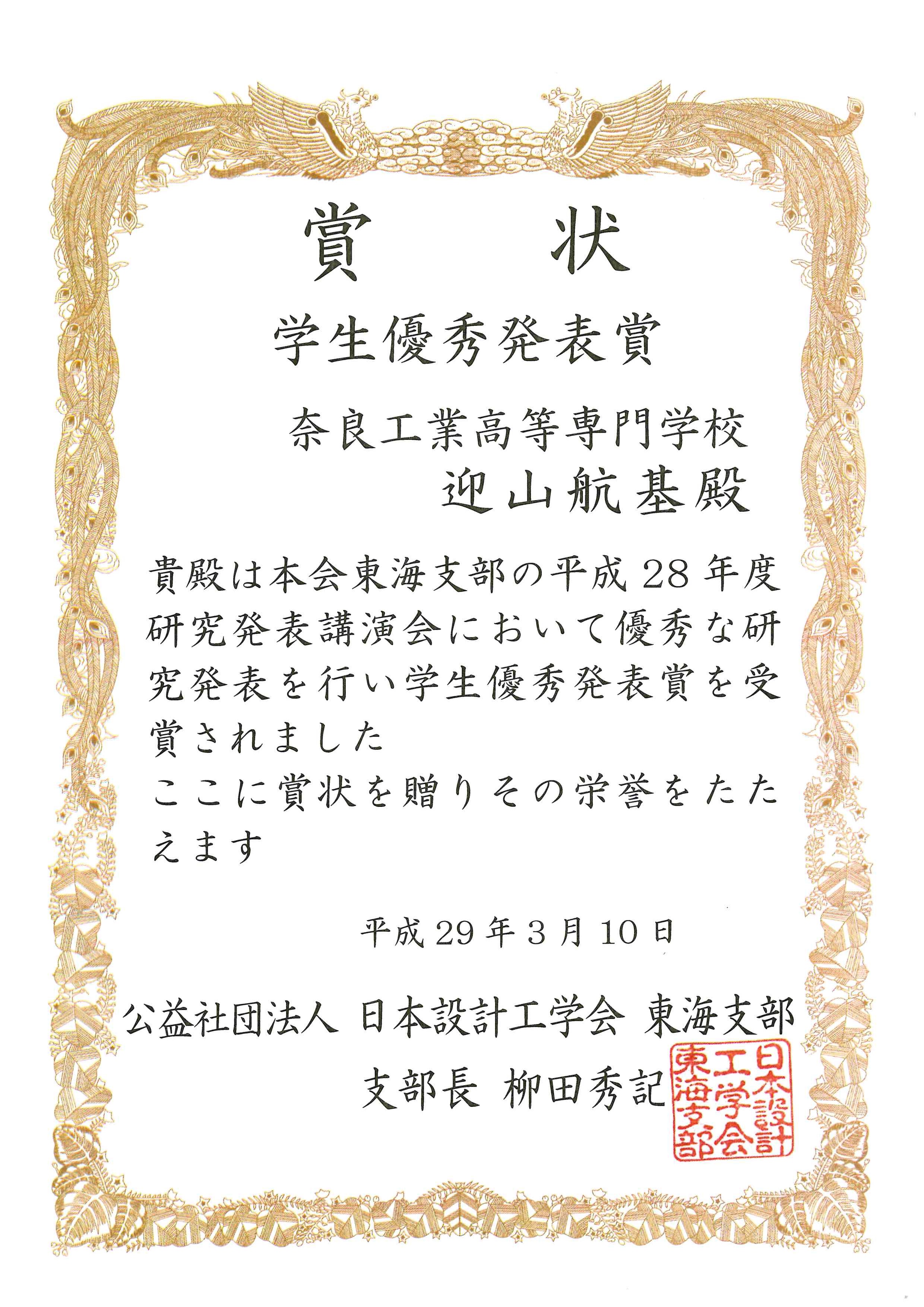 今回、日本設計工学会東海支部の研究発表講演会において、学生優秀発表賞を受賞しました。
