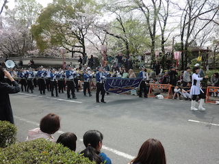 この日は前夜からの雨が朝まで続きパレードが決行されるかとても心配でしたが、午後からのパレードの頃には青空が見えるほどに天気が回復し、満開の桜の中でマーチングを披露することができました。