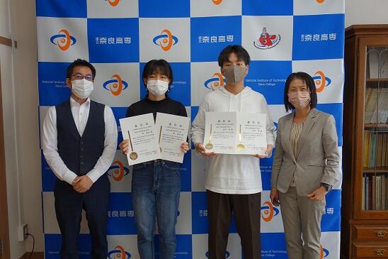 お知らせ 本校専攻科生が日本機械学会関西学生会貢献賞を受賞 2022年3月15日に、本校システム創成工学専攻1年(当時)機械制御システムコース 坊村 竜さん、林 真由さんの2名が日本機械学会関西学生会貢献賞を受賞しました。2021年度の1年間、他大学の大学院生と共に関西学生会の運営委員として活動した功績が認められたものです。本校としては、昨年に引き続き2年連続の受賞となります。 (左から福岡准教授、林さん、坊村さん、後藤校長)