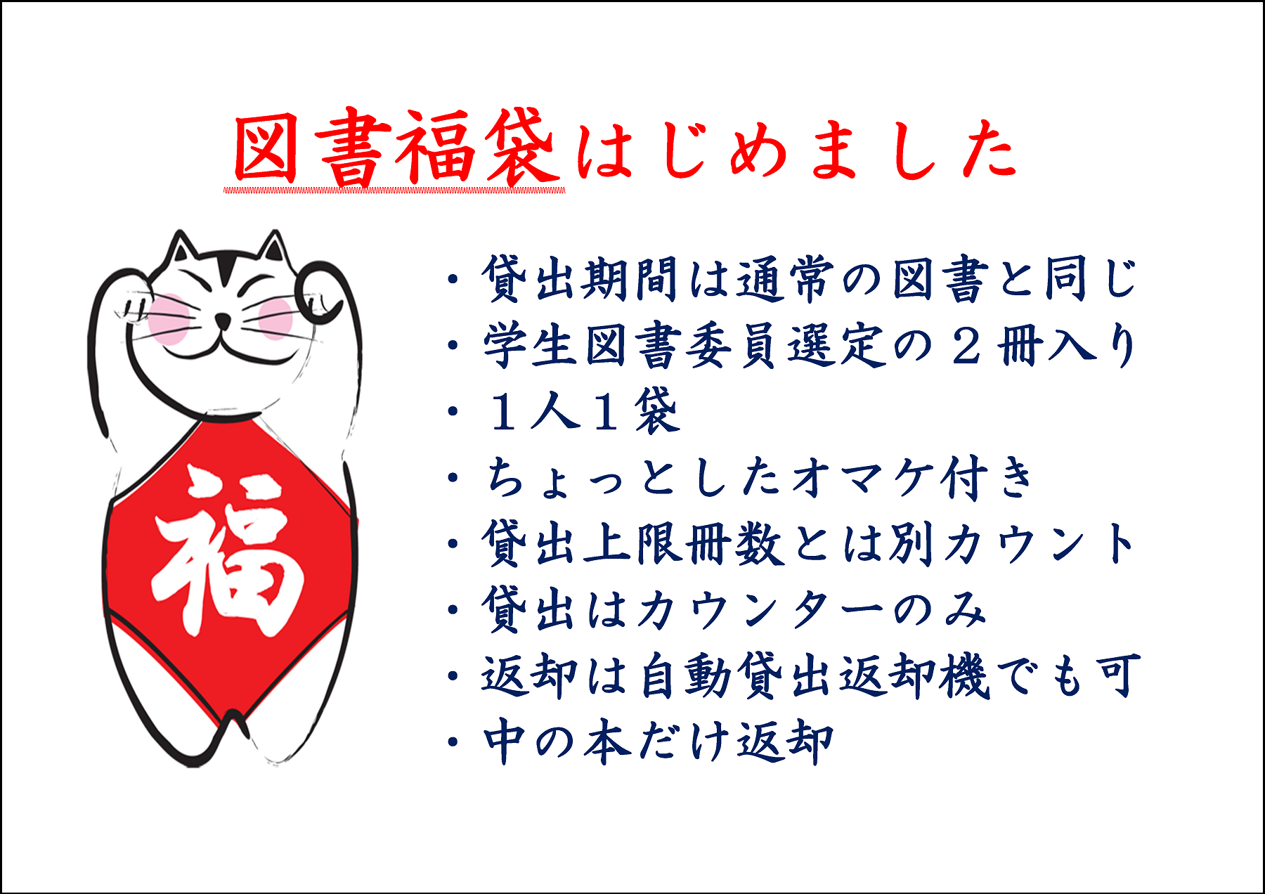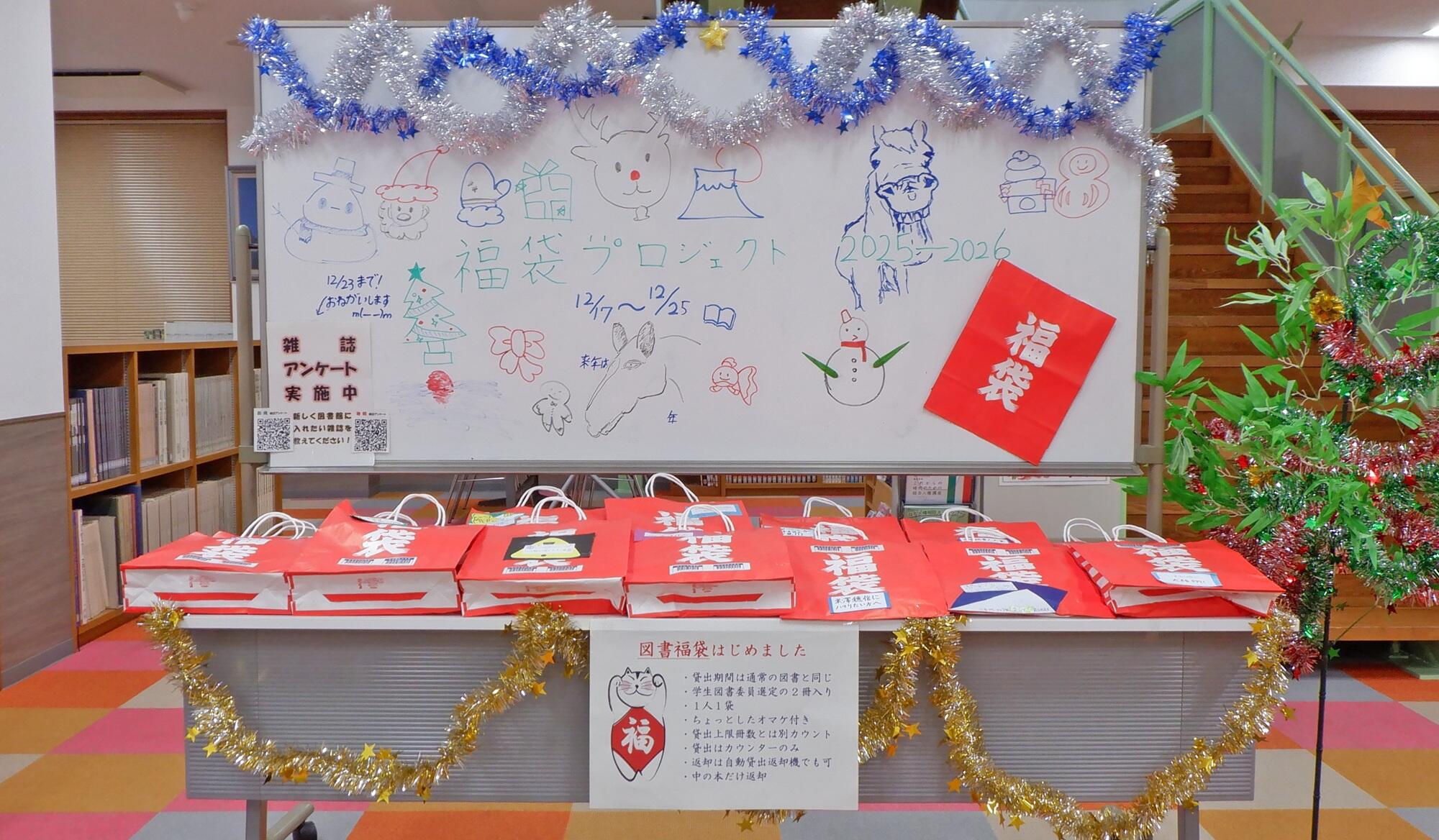 イベント 図書委員会イベント『福袋プロジェクト2025→2026』が始まります! 福袋プロジェクト2025→2026 12月17日(水)から学生図書委員会のイベントである『福袋プロジェクト2025→2026』が始まります! 福袋は1つの袋に図書委員が厳選した本2冊とちょっとしたおまけが入っています。 イベント期間は12月17日(水)から25日(木)までの約1週間で、返却期限は冬休み明けの1月6日(火)です。冬休みのひと時を図書委員がおすすめする本を読みながら、ゆっくり過ごしてはいかがでしょうか。 奈良工業高等専門学校 図書館 〒639-1080 大和郡山市 矢田町22 TEL 0743-55-6015 FAX 0743-55-6018 E-Mail tosho[at]jimu.nara-k.ac.jp[at]を@に変えてから送信してください。