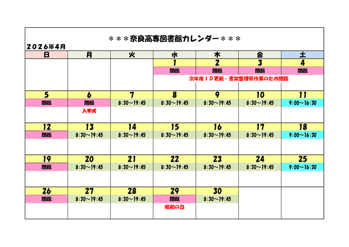 案内 開館カレンダー 奈良工業高等専門学校 図書館 〒639-1080 大和郡山市 矢田町22 TEL 0743-55-6015 FAX 0743-55-6018 E-Mail tosho[at]jimu.nara-k.ac.jp[at]を@に変えてから送信してください。