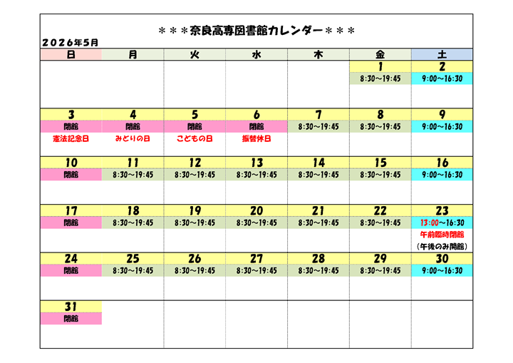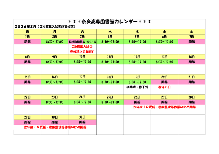 案内 開館カレンダー 奈良工業高等専門学校 図書館 〒639-1080 大和郡山市 矢田町22 TEL 0743-55-6015 FAX 0743-55-6018 E-Mail tosho[at]jimu.nara-k.ac.jp[at]を@に変えてから送信してください。